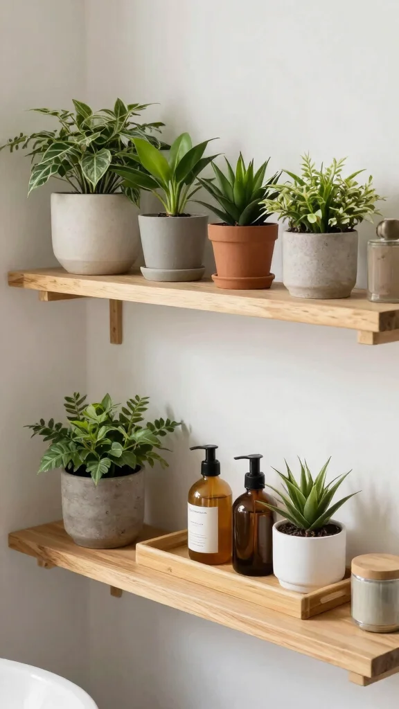 Opt for bamboo trays or wooden shelving for a rustic touch, and add succulents or small potted plants to breathe life into the space.