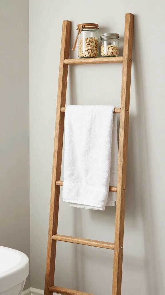 Consider using old glass jars for holding cotton balls or toothbrushes, or convert an old ladder into a rustic towel rack for a crafty element.