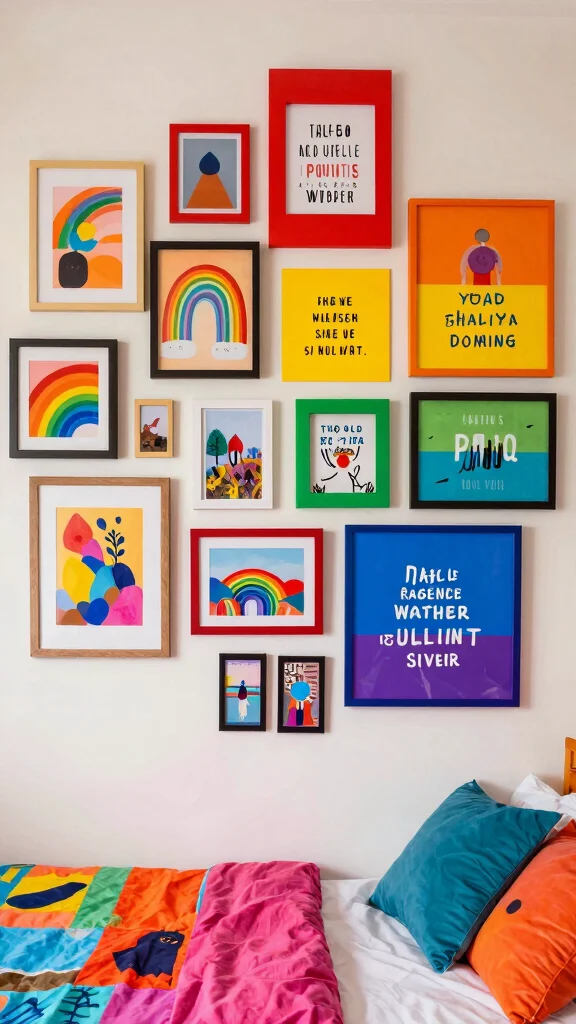 To make this project budget-friendly, you can visit thrift shops for unique frames or even DIY your own artwork. The key is to ensure the colors flow seamlessly, creating a dynamic yet cohesive display that reflects your personality.