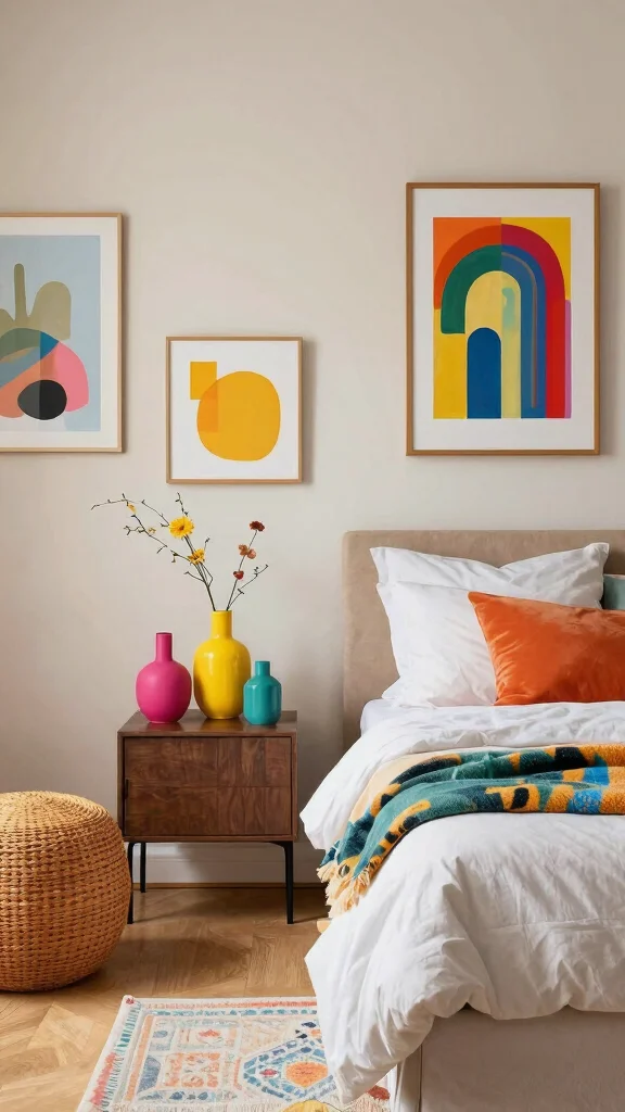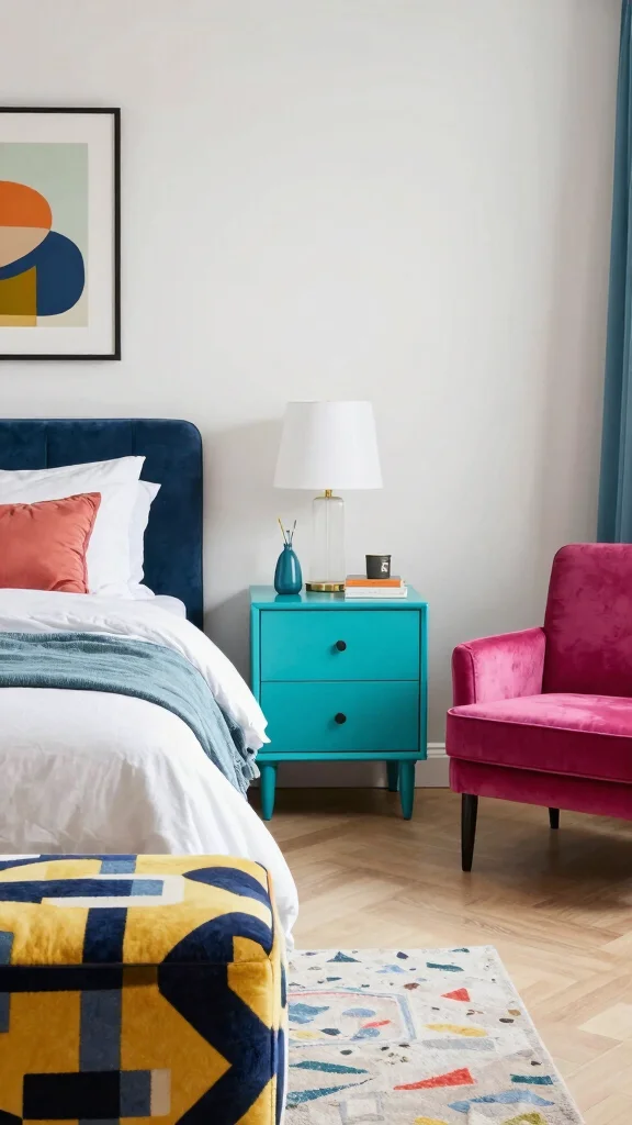 Introduce fun accent furniture that pops with color and character in your bedroom. Bright nightstands or a quirky chair can serve as functional pieces while adding a playful touch to the design. These elements create visual interest and can reflect your personal style, making the space feel uniquely yours.