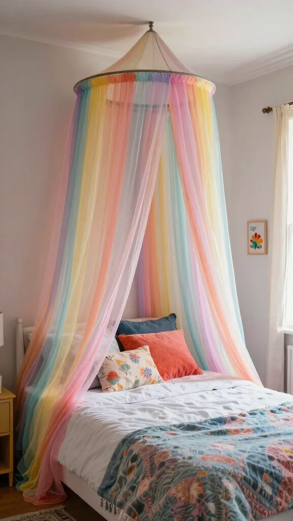 Add a whimsical touch to your sleeping space with a colorful canopy over your bed. This soft addition can create a cozy nook while enhancing the room’s charm. Lightweight fabrics in bright colors or fun patterns resonate beautifully with your decor, making your bed feel like a magical retreat.