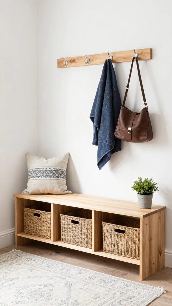 1) Install a slim wall-mounted cabinet or a shallow bench with cubbies to keep essentials off the floor.