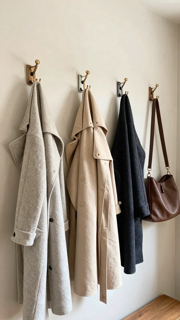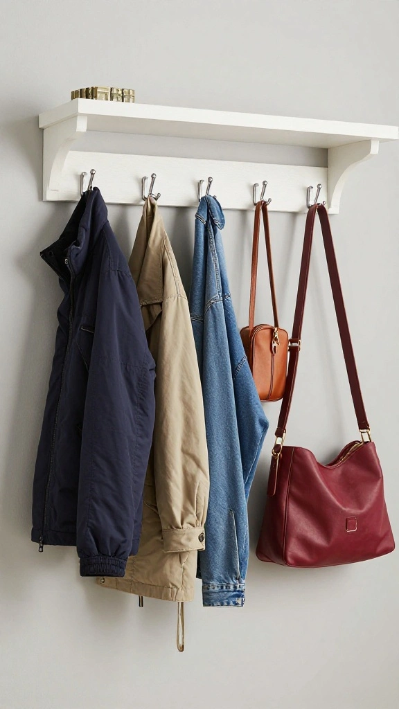 2) Use a single row of wall hooks for jackets and backpacks to maintain a clean line.