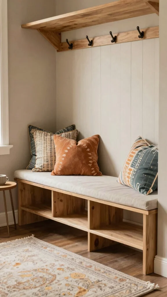 To truly make the most of this idea, look for benches that include integrated shelves or cabinets beneath the seating area. This not only keeps your belongings out of sight but also enhances the overall look of your mudroom.