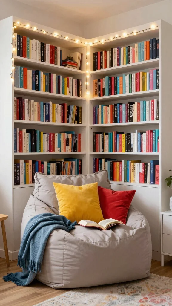 Soft lighting, such as fairy lights or stylish lamps, helps create an inviting atmosphere perfect for curling up with a novel.