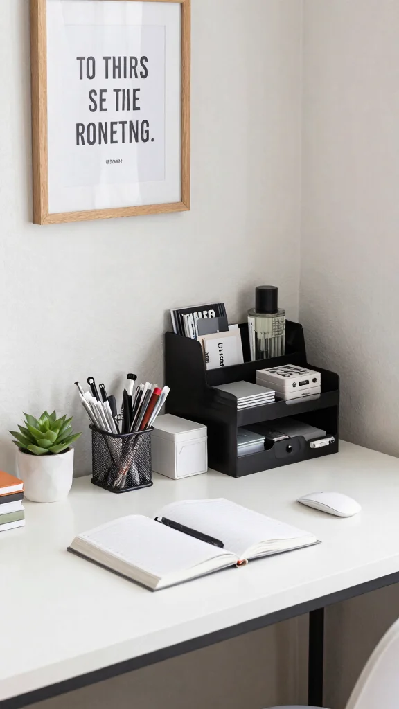 Maintaining a clean and organized workspace is essential for focus. Use decorative bins or drawer organizers to keep everything tidy and accessible.