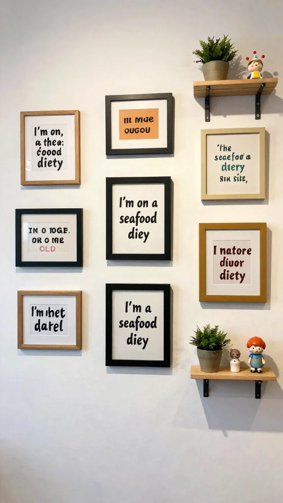 Infuse your walls with personality by embracing witty wall art that brings a smile. This delightful decor choice creates visual harmony and invites laughter into your home. For example, a vibrant print featuring the saying ‘I’m on a seafood diet. I see food, and I eat it!’ can instantly transform your kitchen into a fun and lively space. These charming pieces serve not only as eye-catching focal points but also as fantastic conversation starters when entertaining guests.