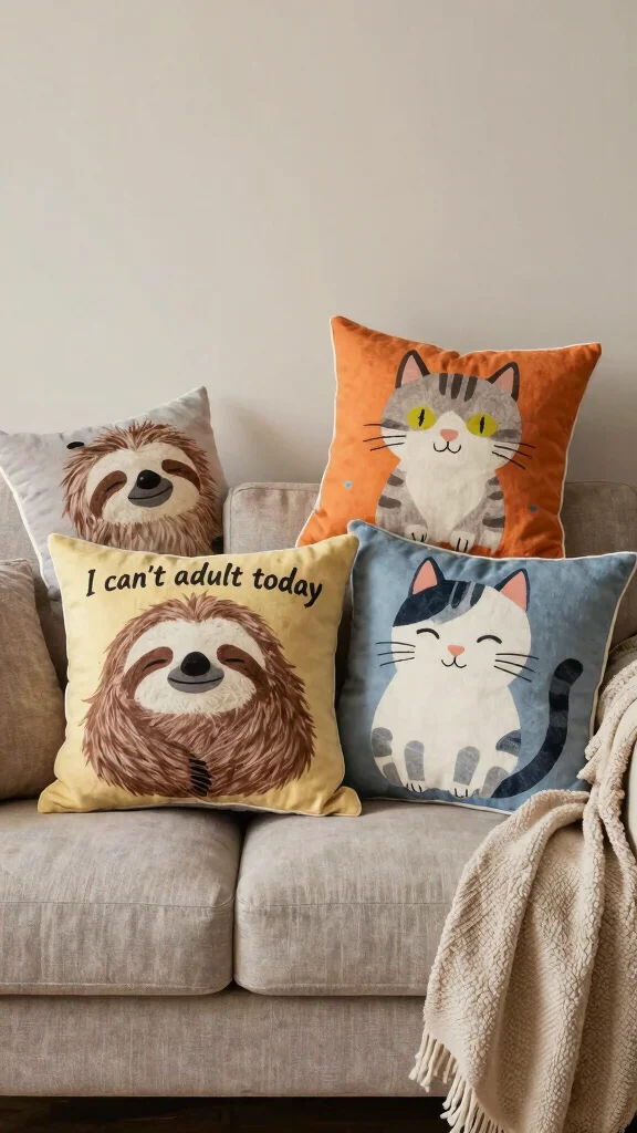 When selecting throw pillows, consider mixing patterns and colors while maintaining a cohesive theme. For a balanced look, pair a bold pillow featuring a funny saying with neutral patterns.