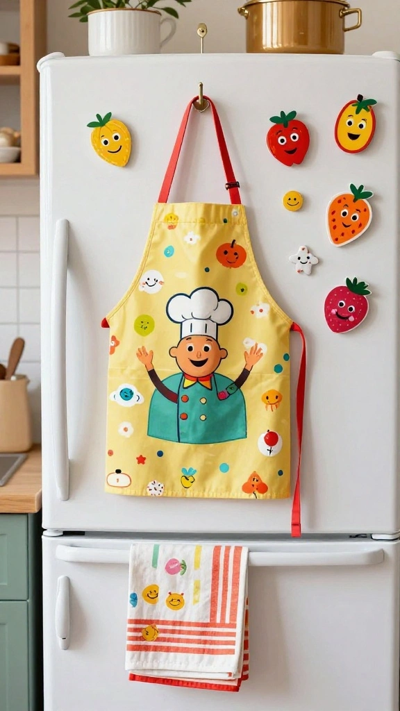 Elevate your kitchen experience with decor that embraces humor and charm. Funny kitchen towels or aprons featuring playful designs can make meal prep an enjoyable adventure. For instance, an apron stating ‘Kiss the Cook’ alongside a whimsical chef illustration can add a delightful touch to your cooking routine.