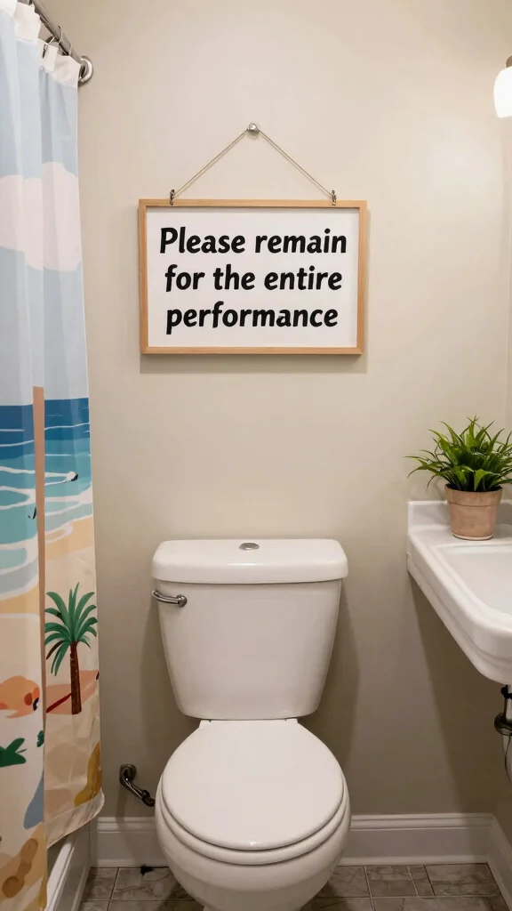 Make your bathroom a source of joy with quirky signs that add humor to everyday routines. Consider placing signs with witty phrases like ‘Please remain seated for the entire performance’ to lighten the mood during private moments. Choosing wood or metal signs can complement various bathroom styles, from modern to rustic.