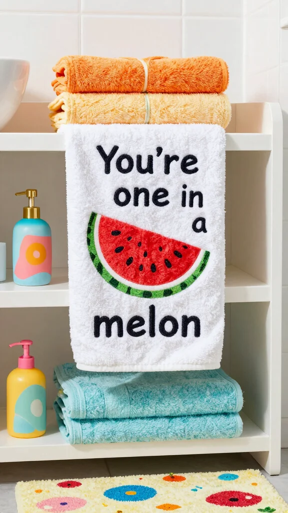 Bring a smile to your washroom with punny bathroom towels that add a touch of humor. Towels featuring phrases like ‘Let’s make a splash’ or ‘You’re one in a melon’ can brighten your space while serving a practical purpose. These quirky towels not only elevate your decor but also create a lighthearted ambiance for visitors.