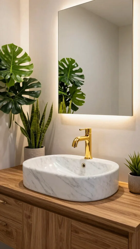 Incorporating vibrant plants brings a refreshing touch and a luxurious feel to your half bathroom, creating a serene atmosphere.
