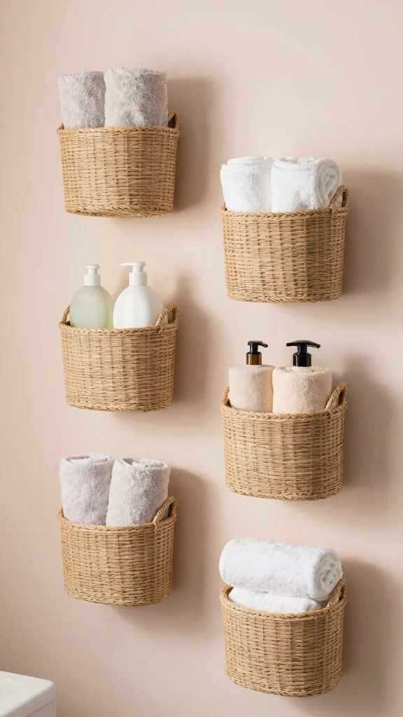 Wall-mounted baskets are a fantastic way to utilize vertical space stylishly. Ideal for extra towels, toiletries, or magazines, these baskets add a rustic charm to your bathroom. Choose soft, natural fiber baskets that blend seamlessly with your decor. Position them at a height that’s easy to access, and consider grouping them for a cohesive look. Hang them on walls or inside cabinet doors for added versatility. Effective use includes:- Grouping similar items together for quick retrieval.- Selecting colors that align with your bathroom theme.- Using baskets of varying sizes to create visual interest.