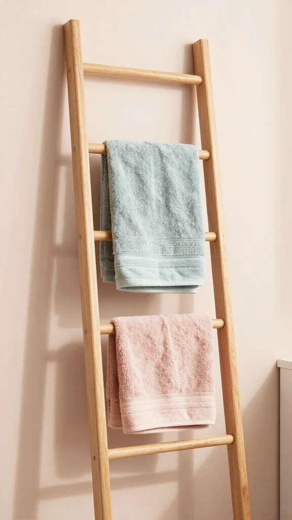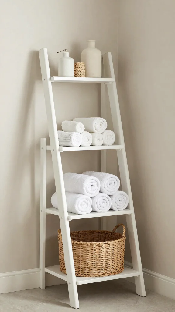 Introduce a ladder shelf to your bathroom for a stylish storage solution. This trendy piece allows you to organize items while displaying decorative accents. Use the lower rungs for baskets and towels, and the top for plants or decorative boxes. Select a design that aligns with your decor style, whether it be rustic wood or sleek metal. A ladder shelf can serve as a statement piece while providing functional storage. To optimize your ladder shelf:- Keep the top tier for decorative items to maintain cohesion.- Use baskets below to conceal miscellaneous items.- Limit displayed items to avoid a crowded look.