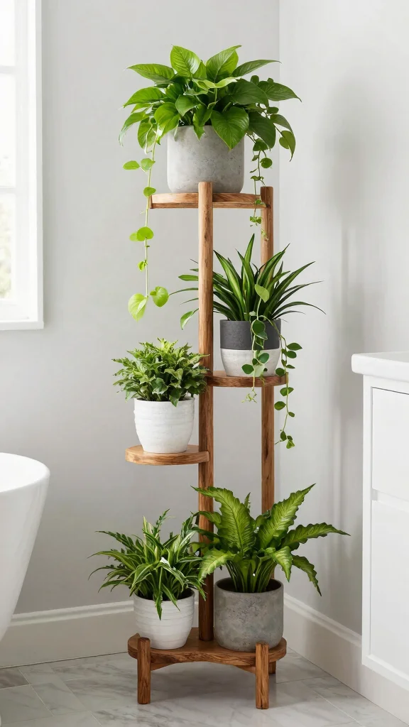 Incorporating greenery into your bathroom enhances the space’s vibrancy and cleanliness. Utilize vertical plant stands to showcase your favorite plants without sacrificing counter space. Position them near windows for optimal light or choose low-light plants for dimmer areas. Select a stand that complements your bathroom’s style—sleek metal for a modern touch or wood for a rustic feel. This addition not only beautifies your decor but also purifies the air. Here are ways to optimize plant stands:- Group plants of varying heights for visual interest.- Choose low-maintenance varieties for hassle-free care.- Ensure the stand is sturdy and fits your bathroom theme.
