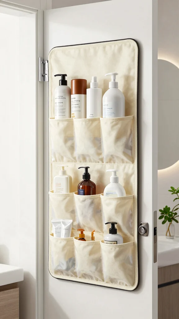 Make the most of your bathroom’s vertical space with over-the-door organizers. These clever solutions turn the back of your bathroom door into a functional storage area, perfect for stashing hair tools, toiletries, and cleaning supplies. By keeping items hidden yet accessible, you can maintain a tidy environment. Opt for organizers with transparent pockets to easily spot your supplies, or select calming colors that fit your decor theme. This approach not only helps minimize visual clutter but also contributes to a serene atmosphere. To maximize your organizer’s potential:- Position frequently used items at eye level for convenience.- Store less necessary products higher up to keep them out of sight.- Combine with other storage solutions for a cohesive aesthetic.
