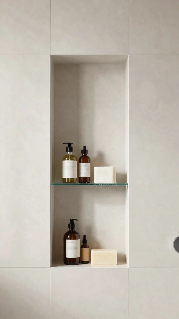 Incorporating niche shelving within your shower can streamline your space while keeping your essentials neatly organized. This built-in solution minimizes clutter and enhances the minimalist design by seamlessly integrating storage into the wall. Opt for glass or simple tile niches to maintain a clean, modern aesthetic. Limit your storage to daily essentials to keep the area looking tidy and tranquil. Here’s how to utilize niche shelving effectively:- Store only daily use products to limit clutter.- Use matching containers for a unified look.- Stick to a minimalist color palette to enhance simplicity.
