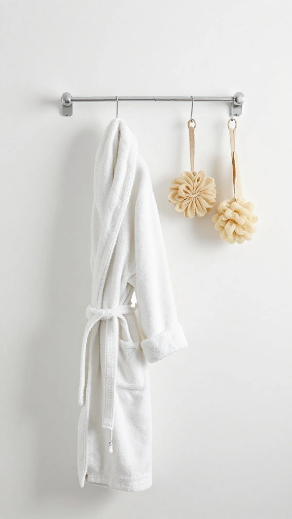 Hanging your bath accessories is a smart method to declutter your space. A simple wall rack can store bathrobes, loofahs, and more, maximizing vertical space while keeping items off the floor. Choose a design—whether wooden or metal—that harmonizes with your bathroom decor. Aim for a clean and open look, ensuring everything remains easily accessible. Maintain a uniform arrangement for a polished and cohesive feel. To effectively implement this idea:- Hang frequently used items at eye level for convenience.- Organize by type—devote one rack to robes, another for loofahs and brushes.- Select durable yet stylish hooks to enhance the overall design.