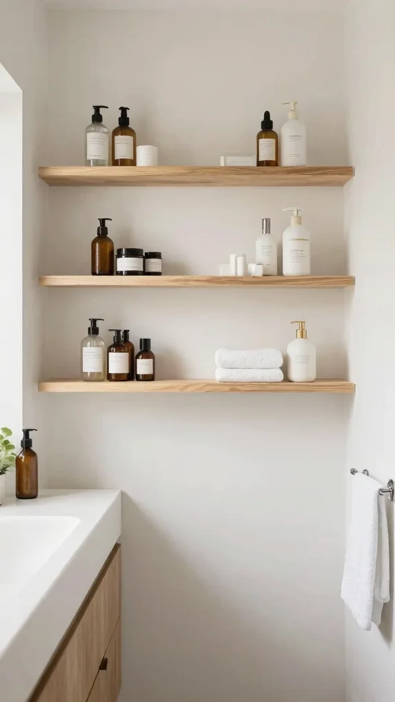 Incorporating floating shelves into your small bathroom can elevate both storage and style. These shelves not only create visual harmony but also add a contemporary touch that makes your space feel larger. By placing them above the toilet or sink, you can showcase decorative elements like plants or neatly folded towels, transforming everyday items into artful displays. To keep a streamlined look, choose shelves in a single color palette. White shelves against soft, light walls enhance an airy atmosphere, while wood tones introduce warmth. Organize your essentials in chic baskets or decorative boxes to maintain both functionality and style. Consider these tips for enhancing your floating shelves:- Pair shelves of varying lengths for a dynamic layout.- Limit displayed items to a few curated pieces for a clean look.- Incorporate a small succulent for a pop of freshness without cluttering the space.